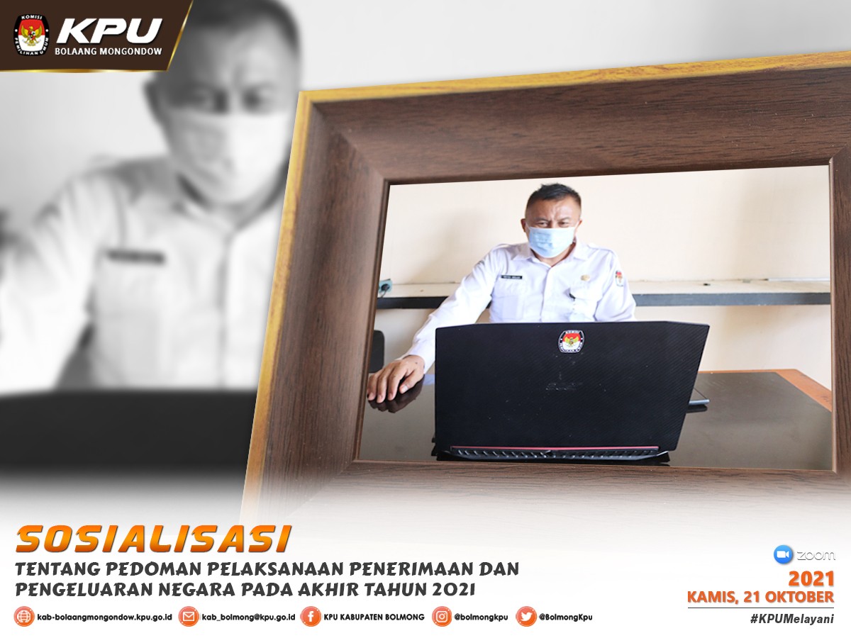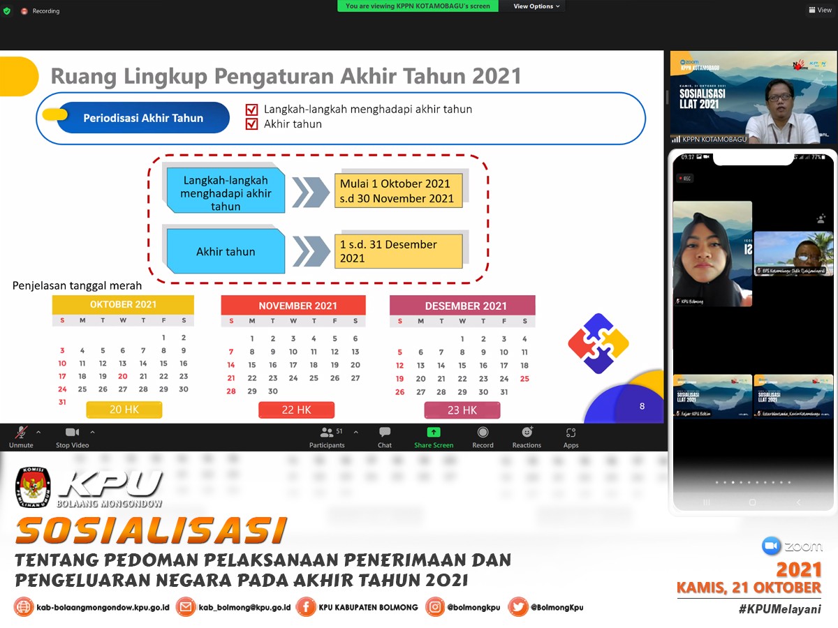 Lolak - Kamis, 21 Oktober 2021, KPU Kab. Bolaang Mongondow mengikuti kegiatan Sosialisasi Langkah-Langkah Akhir Tahun 2021 yang diselenggarakan oleh Kantor Pelayanan Perbendaharaan Negara (KPPN) Kotamobagu secara daring melalui Zoom Meeting yang dimulai pukul 09.00 WITA s.d selesai. Kegiatan ini diselenggarakan dalam rangka mengendalikan saldo Kas Negara dan persiapan tutup buku pada akhir Tahun Anggaran 2021 berdasarkan Per-9/PB/2021 tentang Pedoman Pelaksanaan Penerimaan dan Pengeluaran Negara Akhir Tahun 2021. Sosialisasi langkah-langkah akhir tahun 2021 dihadiri oleh Kuasa Pengguna Anggaran, Pejabat Pembuat Komitmen, Pejabat Penanda Tangan SPM, Bendahara dan Operator satuan kerja mitra kerja KPPN Kotamobagu. Dalam materi yang disampaikan oleh narasumber dari KPPN Kotamobagu ada beberapa point penting yaitu: