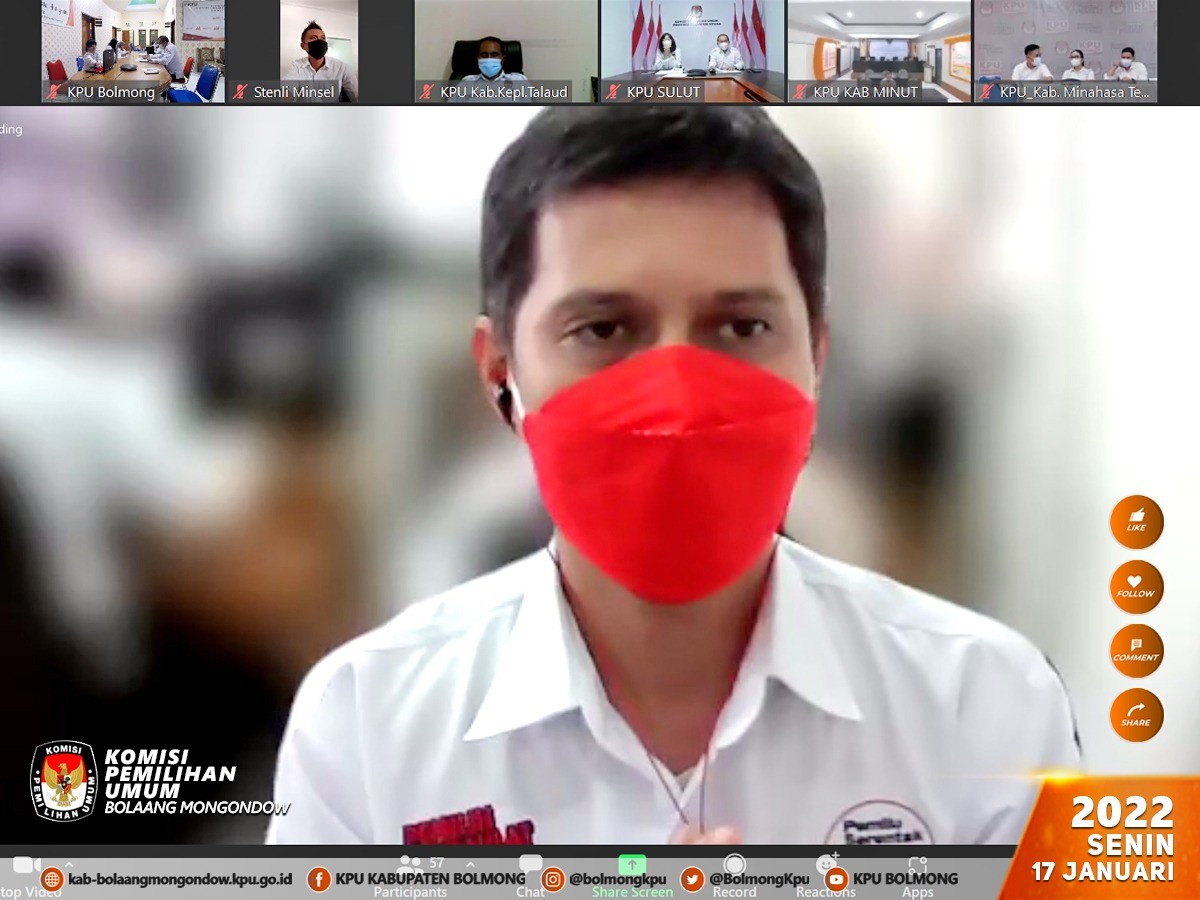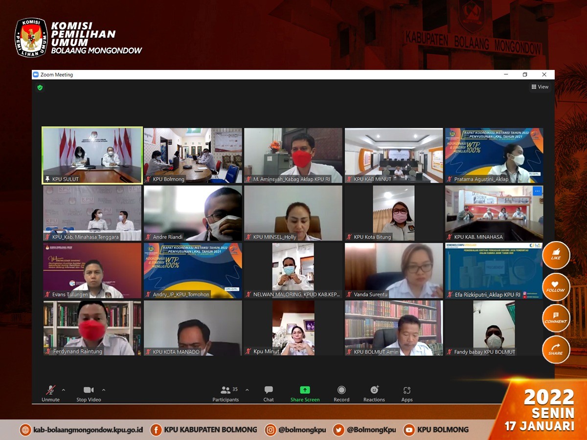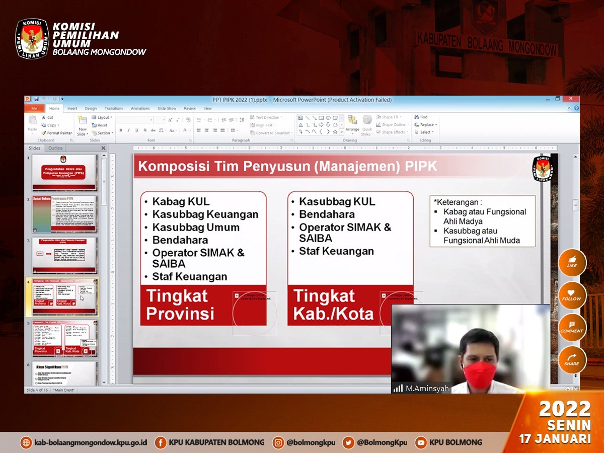 Lolak, Bolmong, kab-bolaangmongondow.kpu.go.id - KPU Kabupaten Bolaang Mongondow mengikuti kegiatan Sosialisasi Pengendalian Intern atas Pelaporan Keuangan (PIPK) yang digelar KPU Provinsi Sulawesi Utara secara daring dengan mengundang Sekretaris dan personel yang tercantum dalam SK PIPK masing-masing satker dari 15 kabupaten/kota, Senin (17/1).