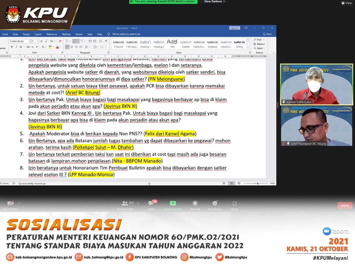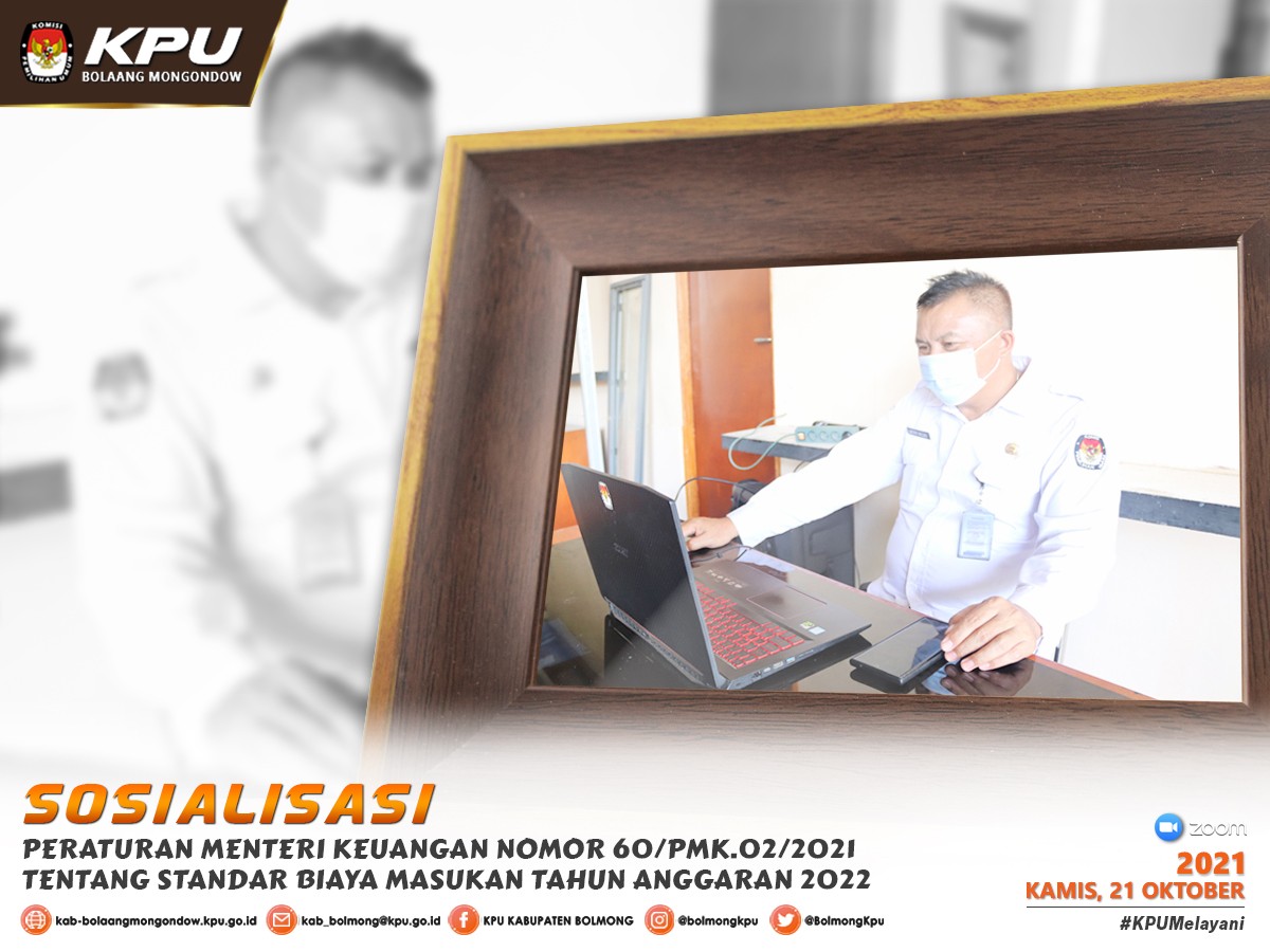 Lolak - Sekretaris KPU Kabupaten Bolaang Mongondow selaku Kuasa Pengguna Anggaran (KPA) mengikuti Sosialisasi Peraturan Menteri Keuangan (PMK) Nomor 60/PMK.02//2021 tentang Standar Biaya Masukan (SBM) Tahun Anggaran 2022 secara daring melalui aplikasi Zoom Meeting pada Kamis 21 Oktober 2021 sebagaimana surat undangan Direktorat Jenderal Perbendaharaan Kantor Wilayah Sulawesi Utara Nomor : UND-106/WPB.30.2021.
