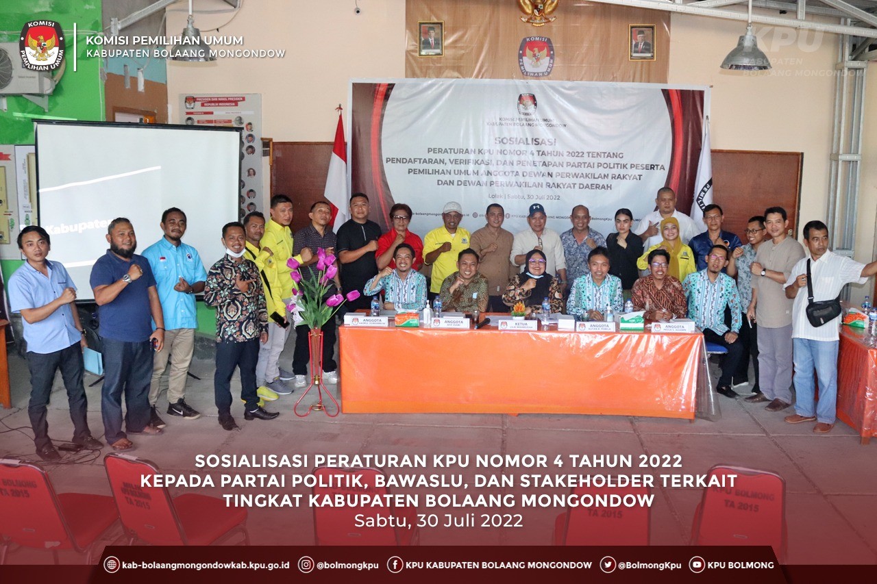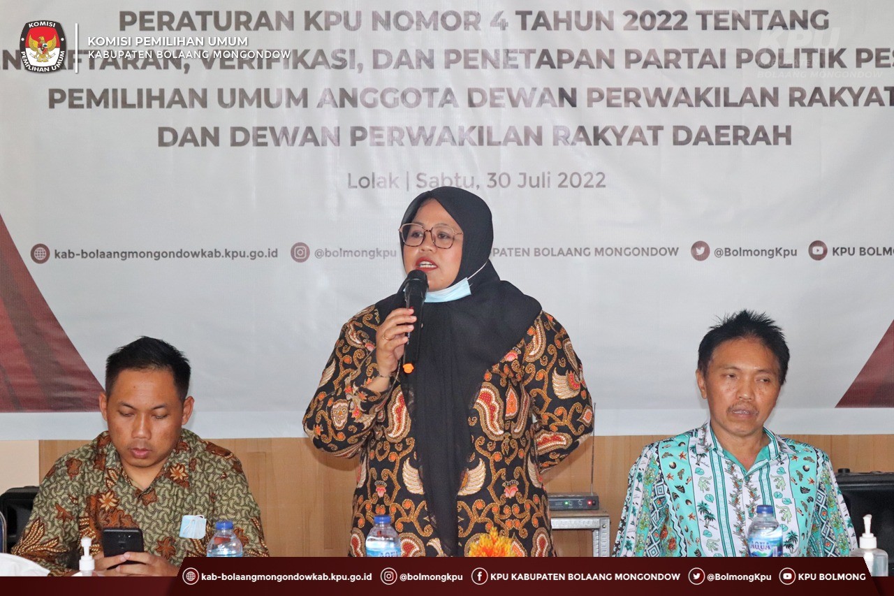 Lolak, kab-bolaangmongondow.kpu.go.id - Ketua KPU Kabupaten Bolaang Mongondow, Lilik Mahmudah membuka kegiatan Sosialisasi Peraturan KPU Nomor 4 Tahun 2022 tentang Pendaftaran, Verifikasi, dan Penetapan Partai Politik Peserta Pemilihan Umum Anggota Dewan Perwakilan Rakyat dan Dewan Perwakilan Rakyat Daerah kepada partai politik dan stakeholder di tingkat Kabupaten Bolaang Mongondow, (30/7).