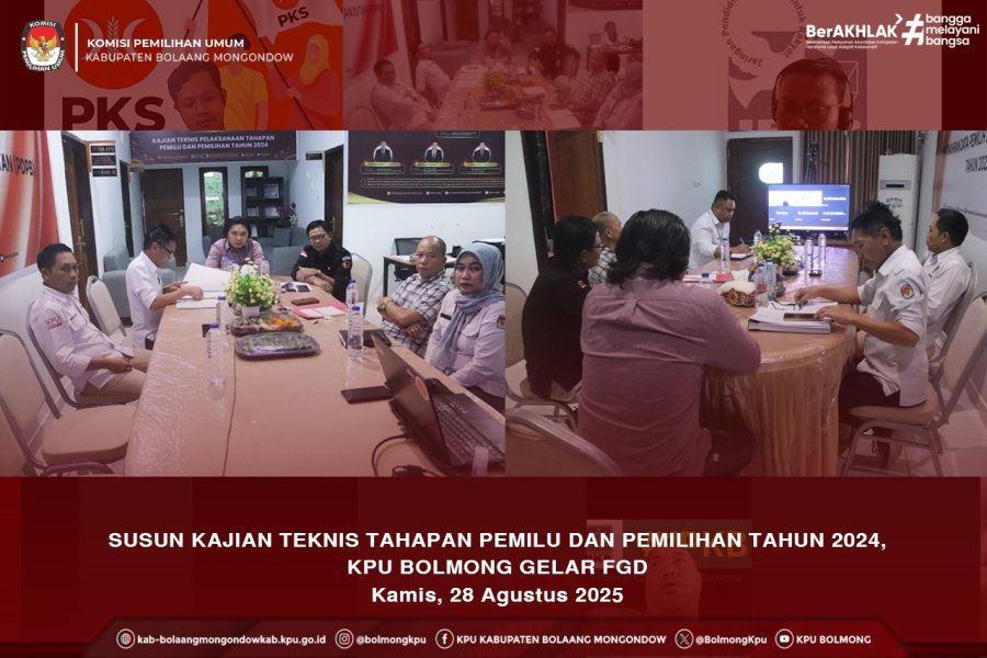 Hal ini menjadi dasar bagi KPU Kabupaten Bolaang Mongondow (Bolmong) melaksanakan Focus Group Discussion (FGD) Kajian Teknis Tahapan Pemilu dan Pemilihan Tahun 2024 pada Kamis, 28 Agustus 2025 dengan mengundang partai politik, stakeholder dan penggiat Pemilu.