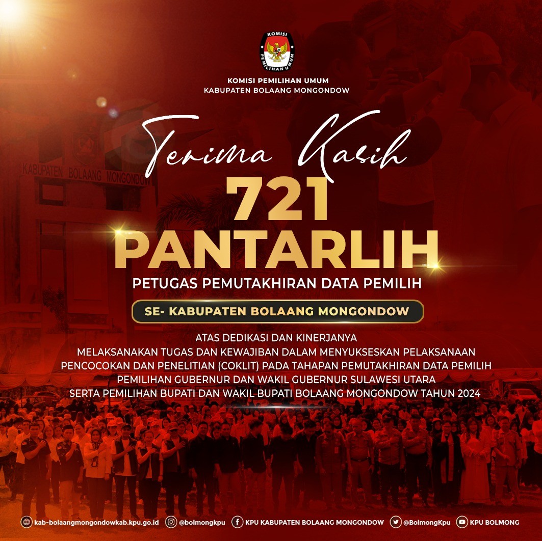 KPU Kabupaten Bolaang Mongondow mengucapkan terima kasih kepada 721 Pantarlih se- Kabupaten Bolaang Mongondow atas dedikasi dan kinerjanya melaksanakan tugas dan kewajiban dalam menyukseskan pelaksanaan pencocokan dan penelitan (coklit) pada tahapan Pemutakhiran Data Pemilih Pemilihan Gubernur dan Wakil Gubernur Sulawesi Utara serta Pemilihan Bupati dan Wakil Bupati Bolaang Mongondow Tahun 2024.