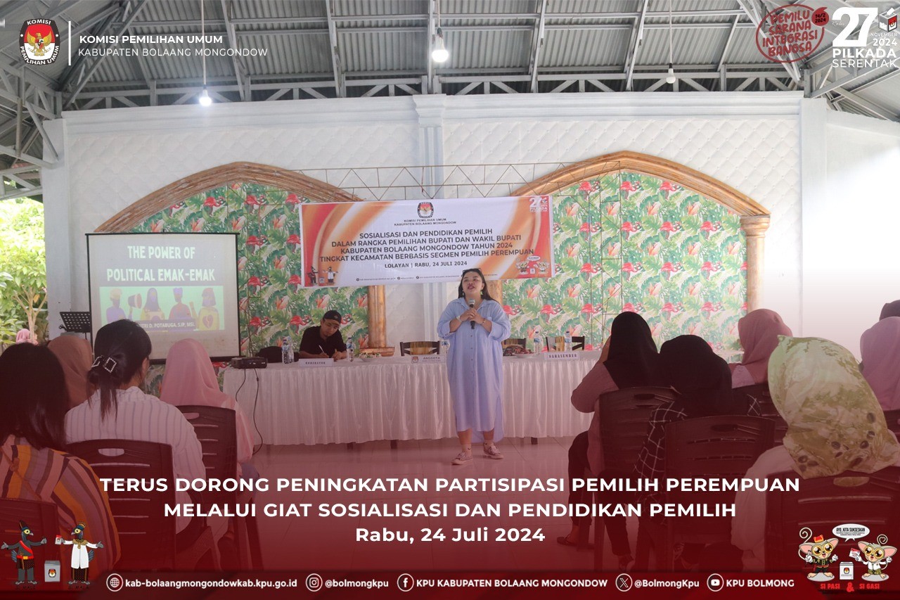 Lolak, kab-bolaangmongondow.kpu.go.id - Dalam rangka menyebarluaskan informasi mengenai tahapan, meningkatkan pengetahuan, pemahaman dan kesadaran masyarakat tentang hak dan kewajiban, serta untuk meningkatkan partisipasi Pemilih dalam Pilkada Serentak Tahun 2024, KPU Kabupaten Bolaang Mongondow kembali melaksanakan kegiatan Sosialisasi dan Pendidikan Pemilih (sosdiklih) berbasis Segmen Pemilih Perempuan, Rabu (24/7/2024).