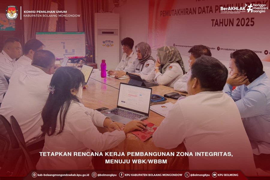Lolak, kab-bolaangmongondow.kpu.go.id - Sebagai tindak lanjut penetapan Tim Pembangunan Zona Integritas (ZI) Menuju Wilayah Bebas dari Korupsi dan Wilayah Birokrasi Bersih dan Melayani (WBK/WBBM), KPU Kabupaten Bolaang Mongondow (Bolmong) melaksanakan Rapat Pembahasan Rencana Kerja Pembangunan Zona Integritas, Senin (25/8).