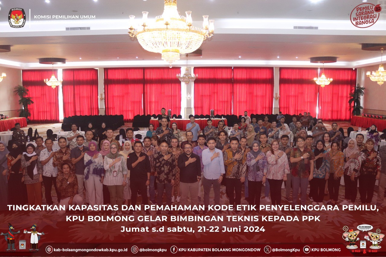 Lolak, kab-bolaangmnongondow.kpu.go.id - Dalam rangka peningkatan kapasitas dan pemahaman tentang kode etik penyelenggara Pemilu serta mitigasi risiko dalam penyelenggaran Pemilihan, Komisi Pemilihan Umum (KPU) Kabupaten Bolaang Mongondow (Bolmong) melaksanakan Bimbingan Teknis Kode Etik Penyelenggara Pemilihan untuk Badan Adhoc Pilkada Tahun 2024,dan kegiatan Mitigasi Permasalahan Hukum Jelang Pilkada Tahun 2024. Kegiatan yang dibuka oleh Ketua Divisi Hukum dan Pengawasan, Yohanes D. Tumengkol ini dilaksanakan selama dua hari sejak tanggal 21 sampai dengan 22 Juni 2024.