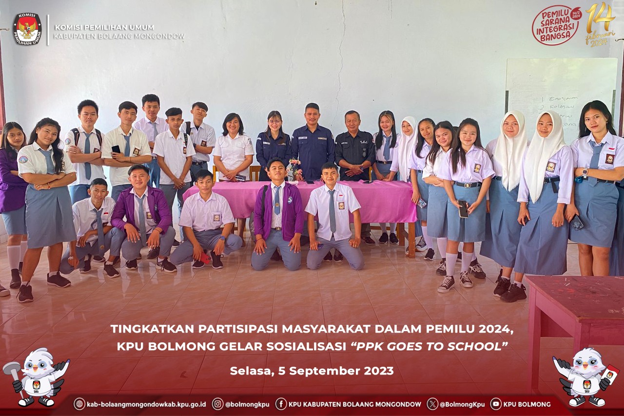Lolak, kab-bolaangmongondow.kpu.go.id - memerhatikan Peraturan Komisi Pemilihan Umum Nomor 3 Tahun 2022 tentang Tahapan dan Jadwal Penyelengaraan Pemilihan Umum Tahun 2024, dan Peraturan Komisi Pemilihan Umum Nomor 9 Tahun 2022 tentang Partisipasi Masyarakat Dalam Pemilihan Umum dan Pemilihan Gubernur dan Wakil Gubernur, Bupati dan Wakil Bupati, dan/atau Walikota dan Wakil Walikota, KPU Kabupaten Bolaang Mongondow (Bolmong) gelar sosialisasi “PPK Goes To School” guna peningkatan partisipasi masyarakat dalam Pemilu Tahun 2024 (5/9).
