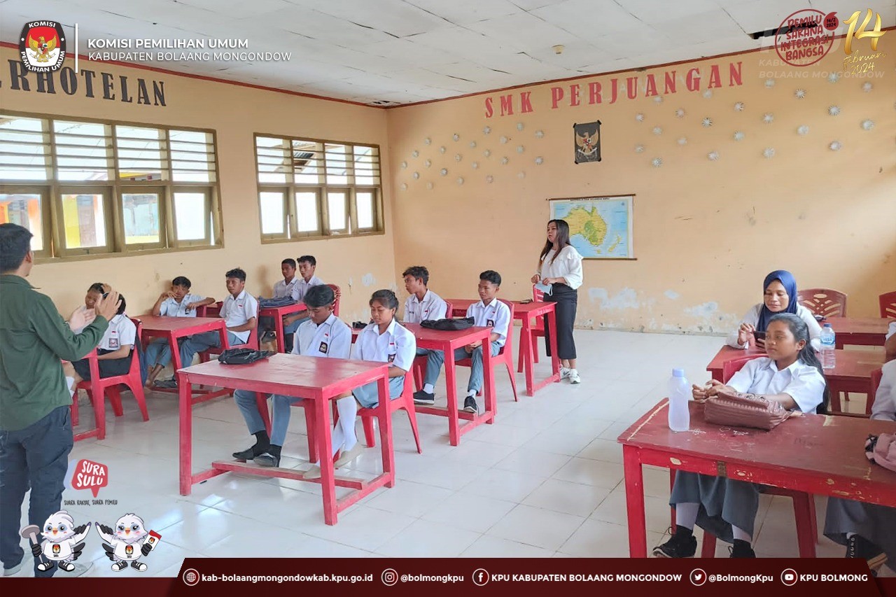 Memerhatikan Peraturan KPU Nomor 3 Tahun 2022 tentang Tahapan dan Jadwal Penyelengaraan Pemilihan Umum Tahun 2024, dan Peraturan KPU Nomor 9 Tahun 2022 tentang Partisipasi Masyarakat Dalam Pemilihan Umum dan Pemilihan Gubernur dan Wakil Gubernur, Bupati dan Wakil Bupati, dan/atau Walikota dan Wakil Walikota, KPU Bolmong melalui PPK Sang Tombolang melaksanakan Sosialisasi kepada Siswa-Siswi di SMK Perjuangan.