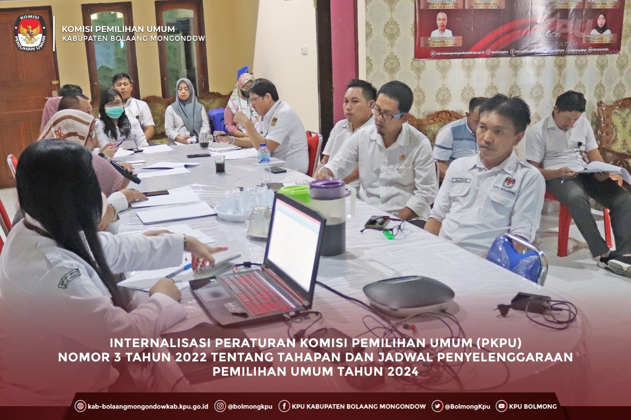 Lolak, kab-bolaangmongondow.kpu.go.id - KPU Kabupaten Bolaang Mongondow menggelar internalisasi produk hukum yaitu Peraturan KPU Nomor 3 Tahun 2022 tentang Tahapan dan Jadwal Penyelenggaraan Pemilihan Umum Tahun 2024, pada Kamis (16/6).