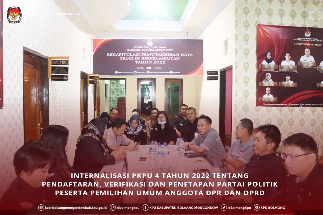 Lolak, kab-bolaangmongondow.kpu.go.id - Dalam rangka meningkatkan pemahaman dan menyamakan persepsi terkait dengan Peraturan KPU Nomor 4 Tahun 2022 tentang Pendaftaran, Verifikasi, dan Penetapan Partai Politik Peserta Pemilihan Umum Anggota Dewan Perwakilan Rakyat dan Dewan Perwakilan Rakyat Daerah, KPU Kabupaten Bolaang Mongondow menggelar Internalisasi Peraturan KPU Nomor 4 Tahun 2022, Selasa (27/7).