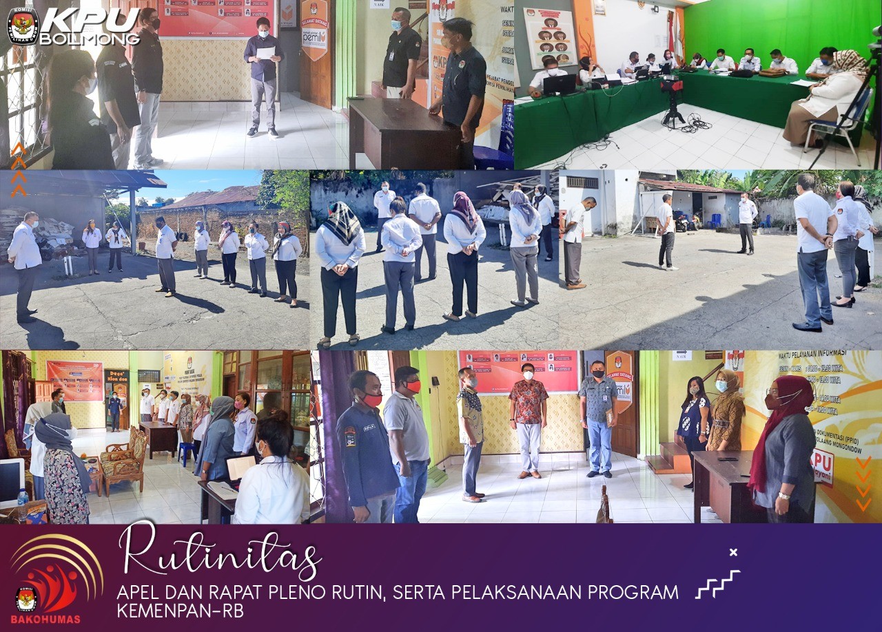 Lolak - Dalam rangka menindaklanjuti surat dinas Ketua Komisi Pemilihan Umum (KPU) Republik Indonesia Nomor 604/SDM.03.5-SD/KPU/VI/2021 perihal Himbauan Pelaksanaan Apel Pagi, KPU Kabupaten Bolaang Mongondow sejak tanggal 1 Juli 2021 secara rutin melaksanakan Apel Pagi setiap hari Senin, memperdengarkan Lagu Kebangsaan “Indonesia Raya” pada hari Selasa dan Kamis serta membacakan naskah Pancasila pada hari Rabu dan Jumat, dengan menerapkan protokol pencegahan dan pengendalian Corona Virus Disease 2019 (Covid-19).