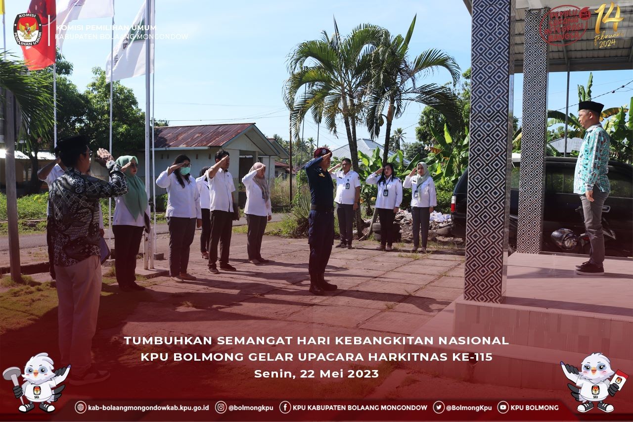 Lolak, kab-bolaangmongondow.kpu.go.id - Senin (22/5), KPU Kabupaten Bolaang Mongondow menggelar Upacara Peringatan Hari Kebangkitan Nasional yang ke 115 dengan tema “Semangat Untuk Bangkit”, yang diikuti oleh seluruh jajaran pejabat dan pegawai di lingkungan KPU Kabupaten Bolaang Mongondow. Kegiatan ini merupakan tindak lanjut Surat Dinas KPU RI Nomor 503/TK.01.1-SD/04/2023 tertanggal 19 Mei 2023 perihal Penyelenggaraan Upacara Peringatan Hari Kebangkitan Nasional Tahun 2023.