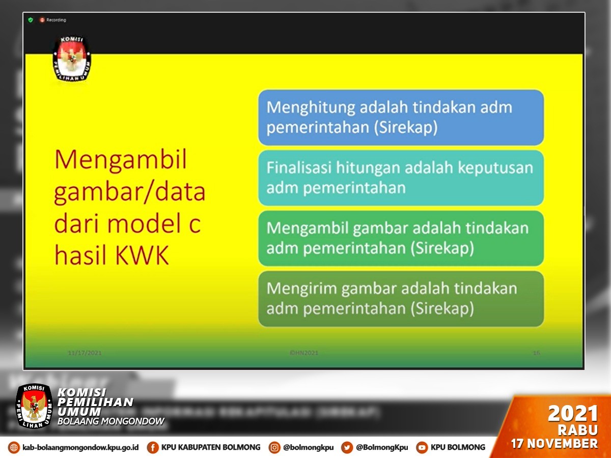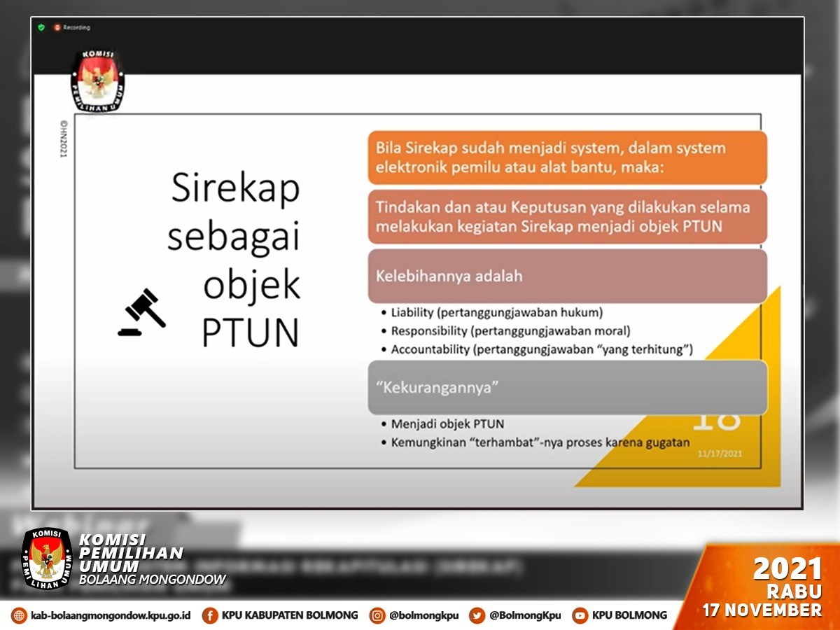 Pada sesi pemaparan materi yang dipandu oleh Titi Anggraini selaku Pegiat Pemilu, menghadirkan narasumber seorang pakar hukum Dr. Harsanto Nursadi, S.H., M.Si yang menyampaikan materi “Penerapan Sirekap pada Pemilu 2024 dalam Prespektif Hukum Administrasi Negara”. Dalam materinya antara lain dijelaskan bahwa proses pengambilan gambar/data dan menghitung data dari model C. hasil KWK melalui aplikasi Sirekap merupakan bagian tindakan, serta keputusan dalam suatu sistem administrasi pemerintahan sebagaimana diatur dalam UU Nomor 30 Tahun 2014 tentang Administrasi Pemerintahan.