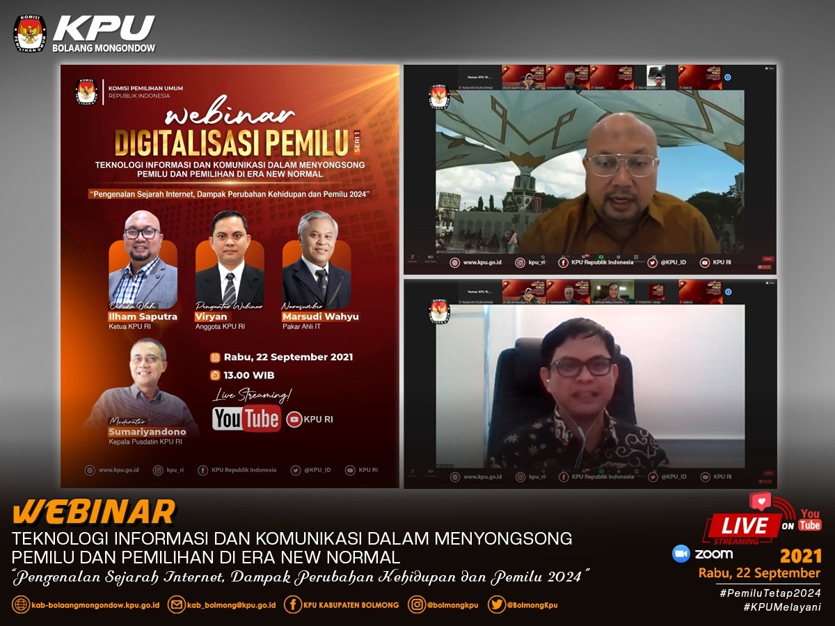 Kegiatan yang disiarkan secara langsung melalui kanal youtube KPU RI ini dipandu oleh moderator, Sumariyandono selaku Kepala Pusat Data dan Informasi (Pusdatin) KPU RI dan hadir sebagai narasumber yaitu Marsudi Wahyu selaku pakar ahli IT dengan materi terkait Sejarah Perkembangan Internet dan Teknologi Digital untuk Pemilu.