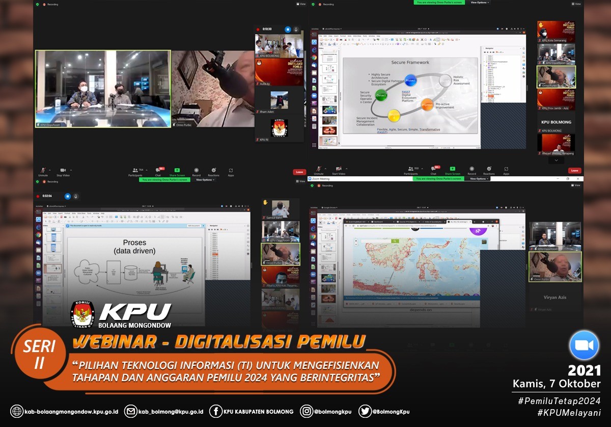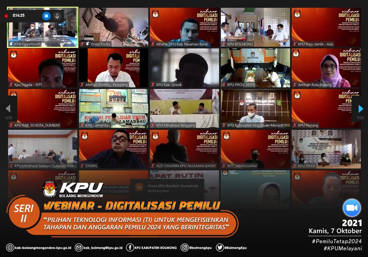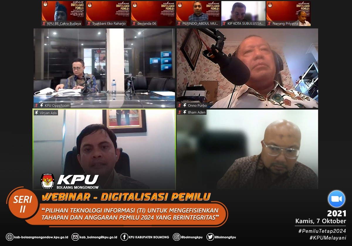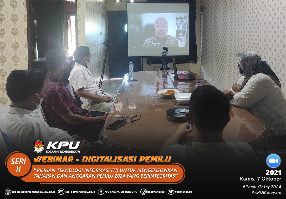 Lolak - Komisi Pemilihan Umum (KPU) RI kembali menggelar Webinar Digitalisasi Pemilu Seri II yang bertajuk “Bisakah Digitalisasi Mengefisienkan Pemilu? “ pada Kamis (7/10) secara daring. Kegiatan ini diikuti oleh Ketua dan Anggota bersama Sekretaris KPU Kabupaten Bolaang Mongondow.