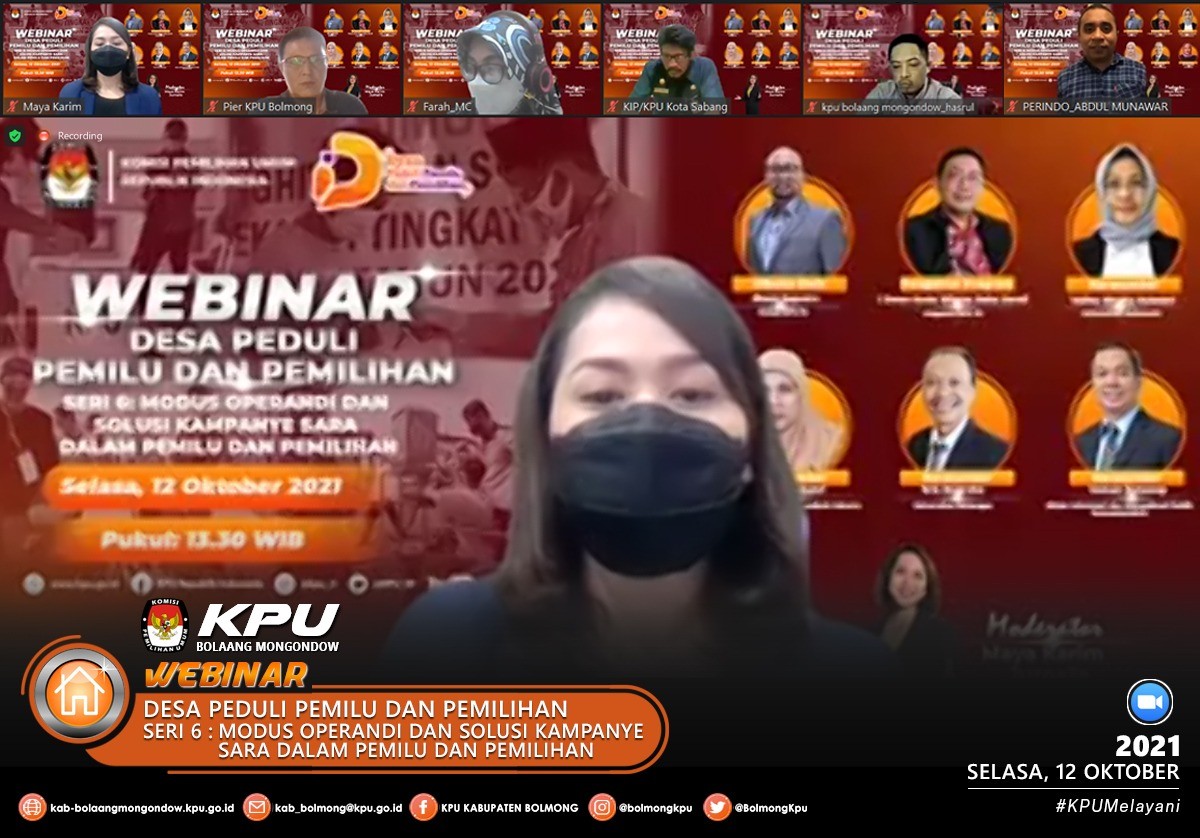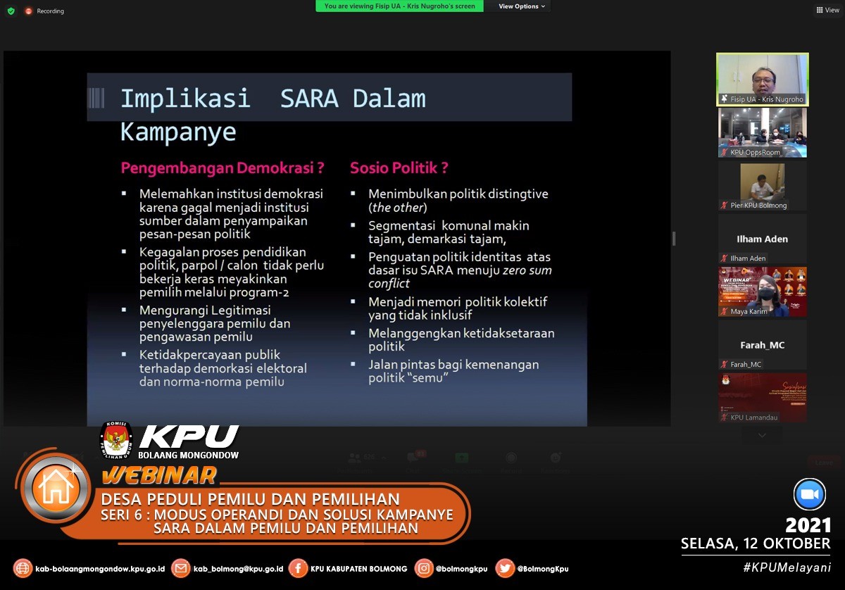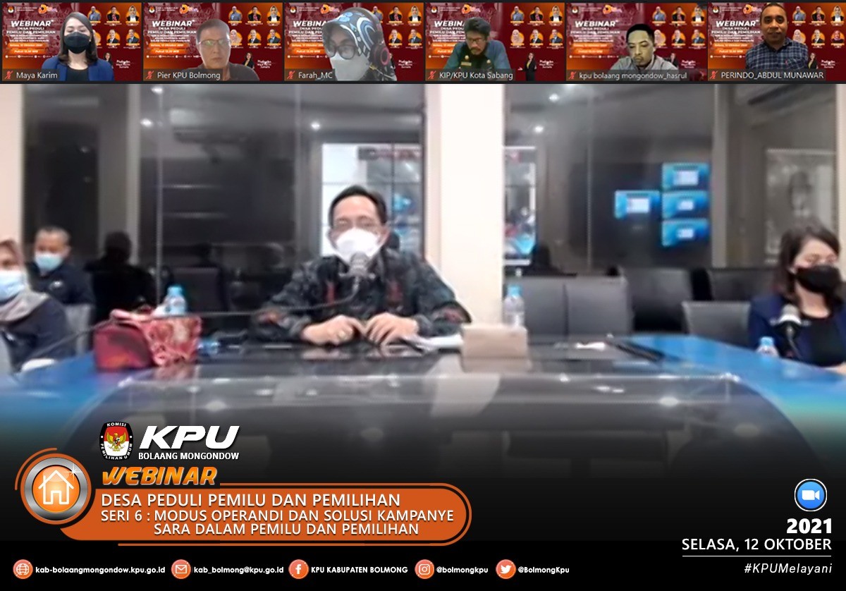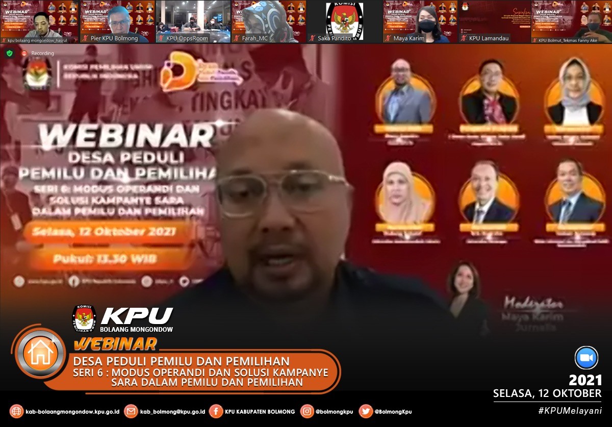 Lolak - Komisi Pemilihan Umum (KPU) Republik Indonesia (RI) kembali menggelar Webinar Desa Peduli Pemilu dan Pemilihan (DP3) pada Selasa (12/10/2021) secara daring dan juga ditayangkan secara streaming melalui kanal Youtube KPU RI. Kegiatan ini merupakan webinar seri ke- 6 yang khusus membahas tema “Modus Operandi dan Solusi Kampanye SARA”
