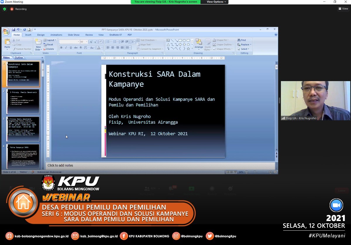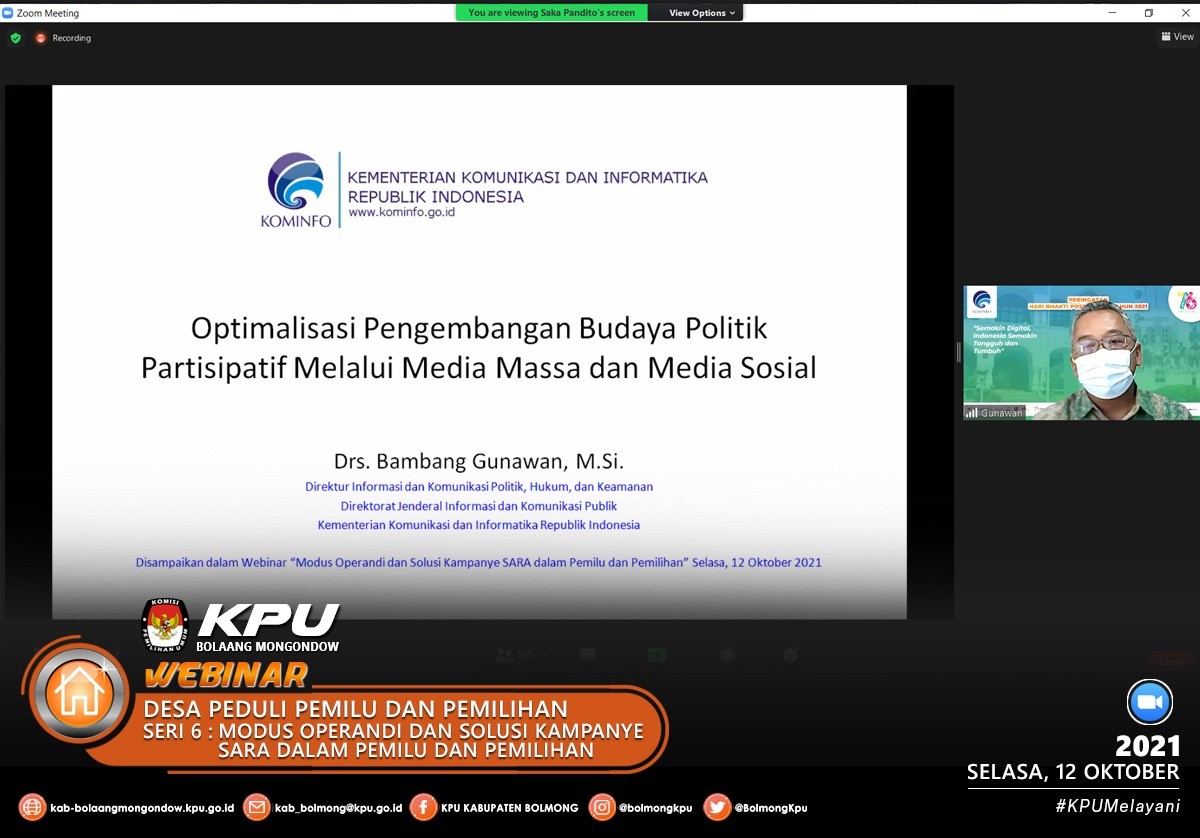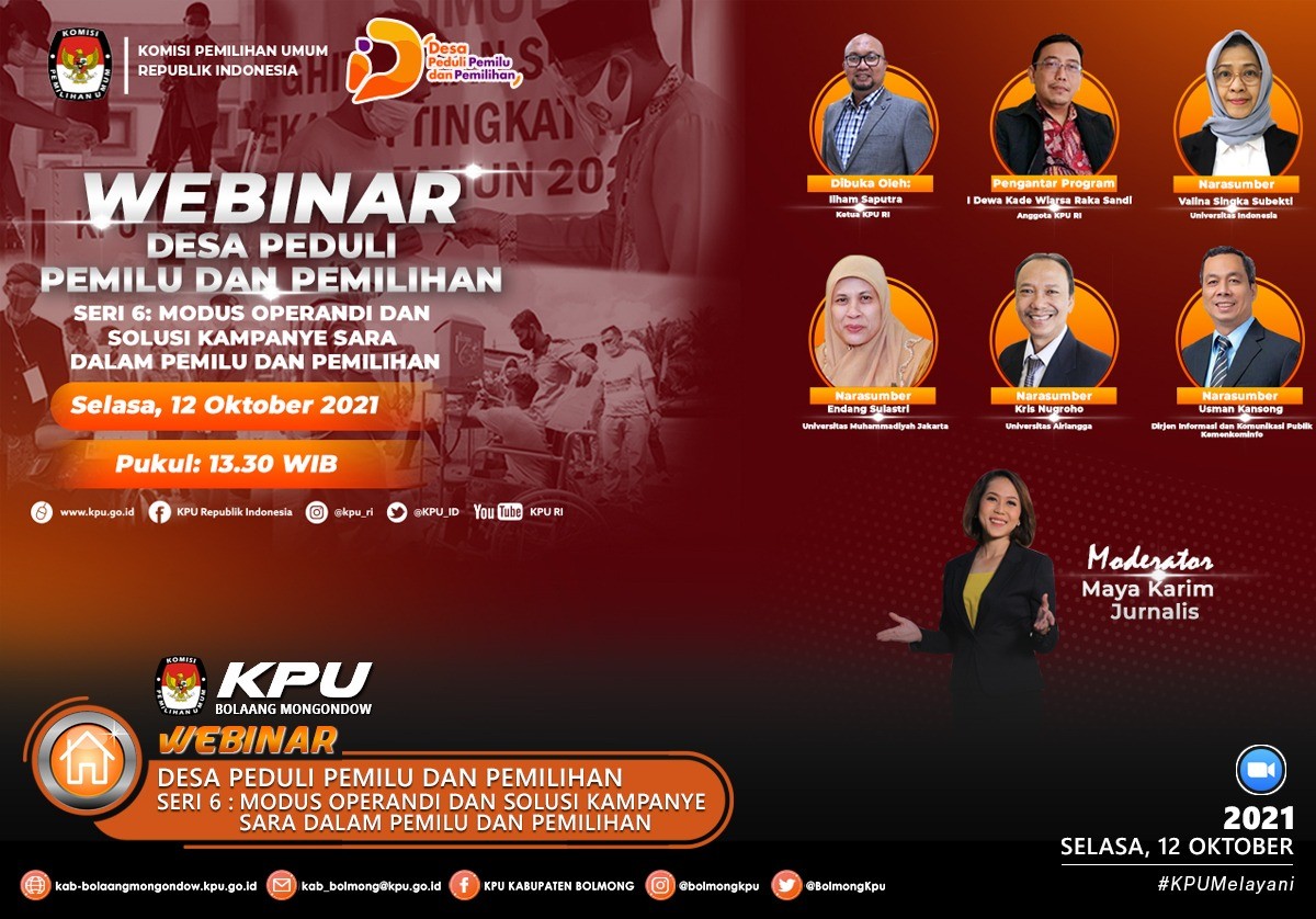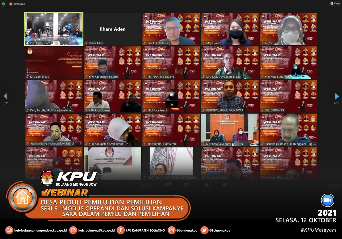 Lolak - Komisi Pemilihan Umum (KPU) Republik Indonesia (RI) kembali menggelar Webinar Desa Peduli Pemilu dan Pemilihan (DP3) pada Selasa (12/10/2021) secara daring dan juga ditayangkan secara streaming melalui kanal Youtube KPU RI. Kegiatan ini merupakan webinar seri ke- 6 yang khusus membahas tema “Modus Operandi dan Solusi Kampanye SARA”