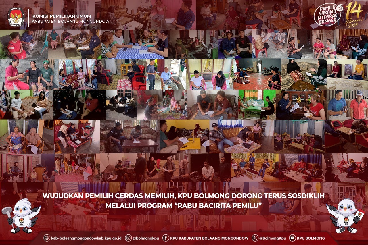 Lolak, kab-bolaangmongondow.kpu.go.id - jelang minggu ke III November 2023, KPU Kabupaten Bolaang Mongondow (Bolmong) dorong terus pelaksanaan sosialisasi dan pendidikan pemilih (Sosdiklih) melalui program “Rabu Bacirita Pemilu” guna mewujudkan pemilih cerdas memilih dalam Pemilu tahun 2024.