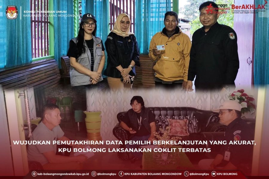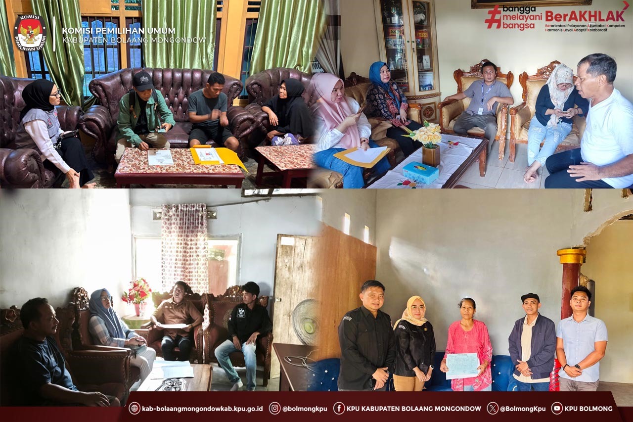 Lolak, kab-bolaangmongondow.kpu.go.id, dalam rangka memastikan pengelolaan Pemutakhiran Data Pemilih Berkelanjutan (PDPB) berkualitas, serta untuk menghasilkan data pemilih yang akurat, KPU Kabupaten Bolaang Mongondow (Bolmong) melaksanakan Pencocokan dan Penelitian (Coklit) terbatas data Pemilih yang dinyatakan Tidak Memenuhi Syarat (TMS), pada Kamis s.d. Jumat (24 - 26 Juni 2024). Kegiatan ini turut didampingi oleh Bawaslu Bolmong.