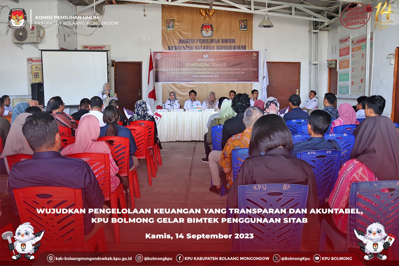 Di awal kegiatan, sekretaris KPU Bolmong, Ratuganesty Mokoginta, dalam kesempatannya menyampaikan tujuan diadakannya Bimtek SITAB ini agar pengelolaan dan laporan pertanggungjawaban anggaran badan Adhoc menjadi lebih transparan dan akuntabel. Sesuai dengan keputusan KPU Nomor 53 tahun 2023 tentang petunjuk teknis penyaluran dan pertanggungjawaban anggaran dana tahapan Pemilu bagi badan Adhoc. Akan tetapi bukan berarti dengan aplikasi SITAB ini tidak serta merta menghalangi kewajiban untuk tetap menyampaikan laporan dalam bentuk hardcopy ke KPU Bolmong.